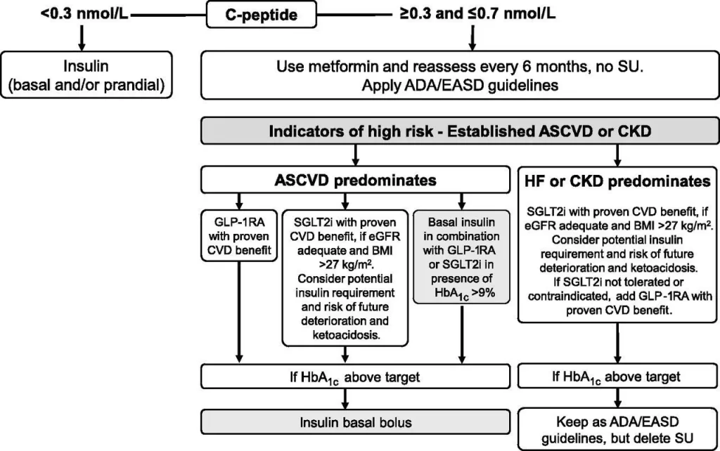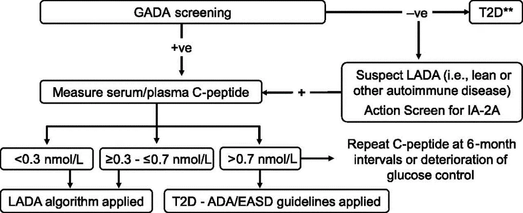 • C-peptide levels >0.7 nmol/L: suggests using a modified ADA/EASD algorithm for type 2 diabetes. Patients should be followed with repeated C-peptide measurements if there is a deterioration of glucose control; note that some of these cases will have false positive autoantibodies and therefore be true type 2 diabetes.