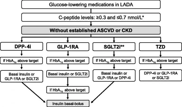 Figure 3: Algorithm for glucose-lowering medications in LADA patients with C-peptide levels ≥0.3 and ≤0.7 nmol/L without established ASCVD (atherosclerotic cardiovascular disease) or CKD (chronic kidney disease). *Deviation from ADA/EASD T2D algorithm. **Increased risk of diabetes ketoacidosis, especially in patients with BMI ≤27.